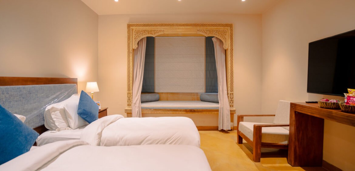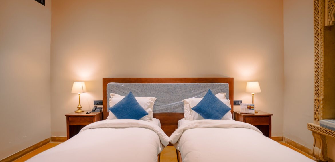 Twin-bedded premium room with a private balcony, perfect for friends or business travelers visiting Jaisalmer.